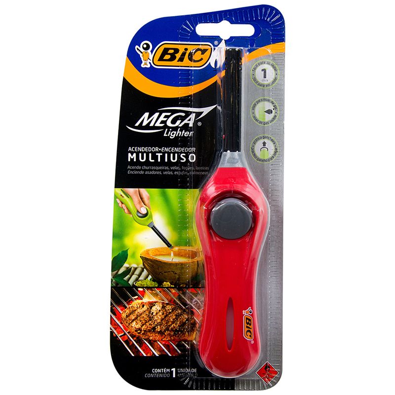 Acendedor Multiúso Mega Lighter modelo U140 da marca Bic. Possui visor para verificação de nível de gás e gancho para armazenamento. Com acendimento em um clique, é indicado para locais como churrasqueiras, velas, fogões e lareiras.