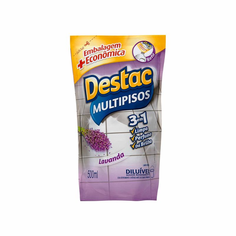 Limpador Multipisos da marca Destac em embalagem com 500 mililitros. Em sachê refil, o produto conta com Lavanda e pode ser diluído em água. Além disso, auxilia na limpeza dos ambientes, trazendo perfume e dando brilho às superfícies. Antes de utilizá-lo, leia as instruções no rótulo.
