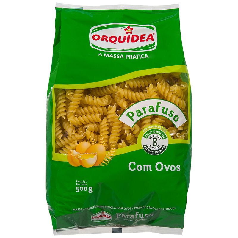 Massa Parafuso, da marca Orquídea, em embalagem com 500 gramas. Feita com sêmola de trigo e ovos, é uma opção deliciosa para quem aprecia a culinária italiana. Apresenta um formato em espiral que ajuda a reter molhos, proporcionando uma explosão de sabor a cada garfada. Oferece uma textura rica e saborosa, tornando os pratos ainda mais especiais. É ideal para uma variedade de receitas, desde clássicos, como macarronada com molho de tomate, até criações mais elaboradas com molhos cremosos ou pesto. Seu preparo é rápido, bastando 7 minutos para o ponto al dente e 10 minutos para uma textura macia. É perfeita para almoços em família ou para jantares com amigos. Sua porção de 80 gramas (1 xícara de chá) contém 290 calorias, 60 gramas de carboidratos, 9,2 gramas de proteínas e 6,4 miligramas de sódio. Para conservação do produto, é recomendado que seja mantido em local seco e fresco, longe da incidência de luz solar direta.