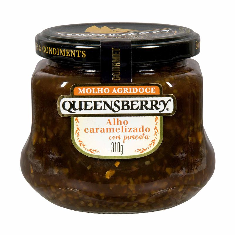 Molho Agridoce de Alho Caramelizado com Pimenta, da marca Queensberry, vem em embalagem com 310 gramas. Com sabor intenso, mistura as notas picantes da pimenta com o sabor marcante do alho. Elaborado com ingredientes selecionados, sua receita leva açúcar, vinagre balsâmico, alho desidratado, vinho branco, suco de limão e pimenta. Versátil, pode ser combinado com diferentes acompanhamentos, como carnes vermelhas, sanduíches e alimentos defumados. Sua porção de 20 gramas (1 colher de sopa) possui valor energético de 52 kcal e 13 gramas de carboidratos.